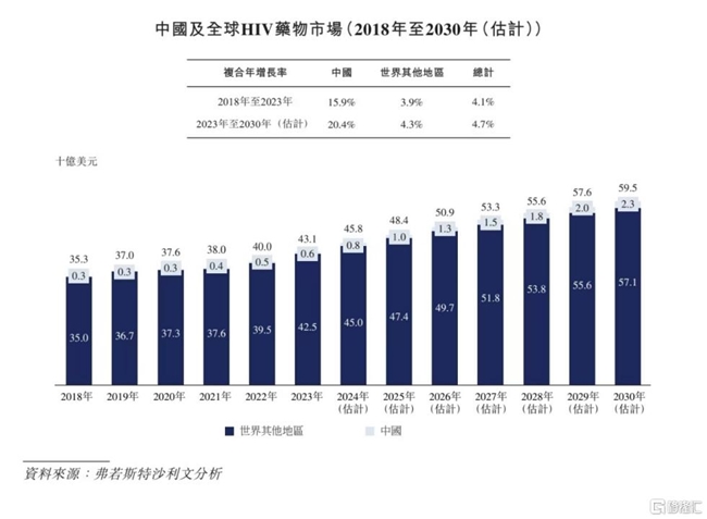 根據弗若斯特沙利文分析,到目前為止,全球艾滋病患者已超過4200萬,2030年預計超4800萬。全球HIV藥物市場由2018年的353億美元增長至2023年的431億美元,復合年增長率為4.1%。估計2030年將達到595億美元,2023年至2030年的復合年增長率為4.7%。
