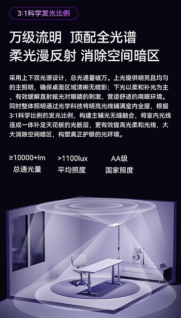 書客 Sun Pro 照明迎來全新升級,以創新的上下雙光源設計,實現總光通量突破萬流明,帶來更專業的護眼照明體驗。上光提供明亮均勻的主照明,確保桌面區域清晰可見,無暗影干擾;下光則以柔和補光為主,有效降低直射眩光對眼睛的刺激,營造舒適的用眼環境。產品融合先進光學科技,精準控制光線分布,使明亮光線均勻覆蓋全屋。在光學設計上,書客 Sun Pro 采用科學驗證的 3:1 主輔光比例,填補天花板光斷層,實現光線無縫銜接,減少空間暗區,顯著提升整體光環境的柔和度。同時,搭載三重減影技術與 SunPath 多維漫射系統,采用 360° 環繞式側發光,內置光源芯片模塊,經過多重反射與柔和擴散處理,使光照柔和度提升 89%。光線自內而外均勻鋪展,實現真正的無黑邊、全覆蓋,不僅全方位照亮桌面,還能有效削減手部及頭部陰影,打造更舒適、無壓迫感的用眼體驗。
