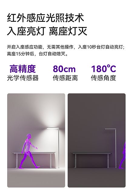 用戶的使用體驗也是書客研究創新的重點,為了提升使用便捷性,書客 Sun Pro 增加了免觸控智能操控功能,只需一句簡單的呼喚“小書”,即可輕松掌控光源,支持語音控制開關燈,無需手動操作,暢享智能化照明新體驗,實現人來燈亮自動化智能場景。不僅如此,紅外感應光照技術進一步升級,配備高精度光學傳感器,感應距離達 80cm,180° 廣角精準感應。開啟入座感應功能后,用戶只需入座 10 秒,臺燈便會自動亮起;離座 15 分鐘后,燈光自動熄滅,無需擔心因匆忙離開而忘記關燈,智能更節能。
