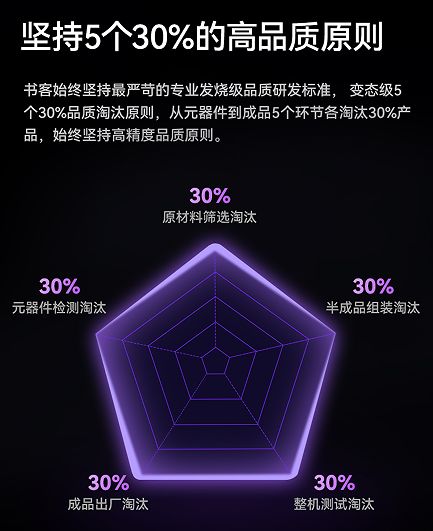 Suker書客秉承旗艦級品質標準,依托大型項目研發與生產經驗,嚴格打造全流程生產、檢測與品控體系。光品質檢測涵蓋50余項標準,遠超行業普遍的5-10項檢測范圍。同時,書客堅持發燒級嚴苛品質標準,執行“5個30%”高精度品質淘汰原則——從元器件到成品的五大關鍵環節,逐級篩選淘汰30%產品,確保最終成品達到卓越的品質水準,真正做到精益求精。