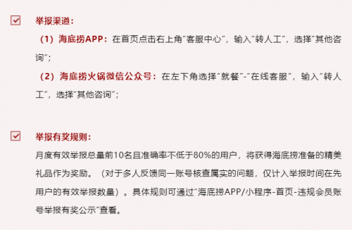 自2024年7月12日起,海底撈通過小程序、APP以及門店電視屏等多個渠道發布了舉報有獎聲明,期待顧客積極參與其中,共同維護每位顧客的合法權益。
