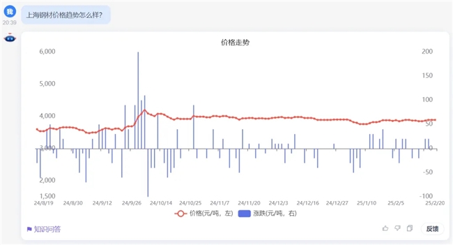 當工業大數據遇上DeepSeek超強算力,找鋼AI實現數據處理能力三級跳!嵌入胖貓云后,找鋼AI將憑借智能化交互體驗的全面升級,為鋼貿企業打造全場景智能中樞。通過AI驅動,不僅能幫助客戶進行價格趨勢分析,還能助力客戶快速獲取與之相關的倉儲、物流等數據,通過智能風控實時攔截交易風險,輔助企業從價格博弈轉向價值經營,從而實現降本增效與智慧決策。
