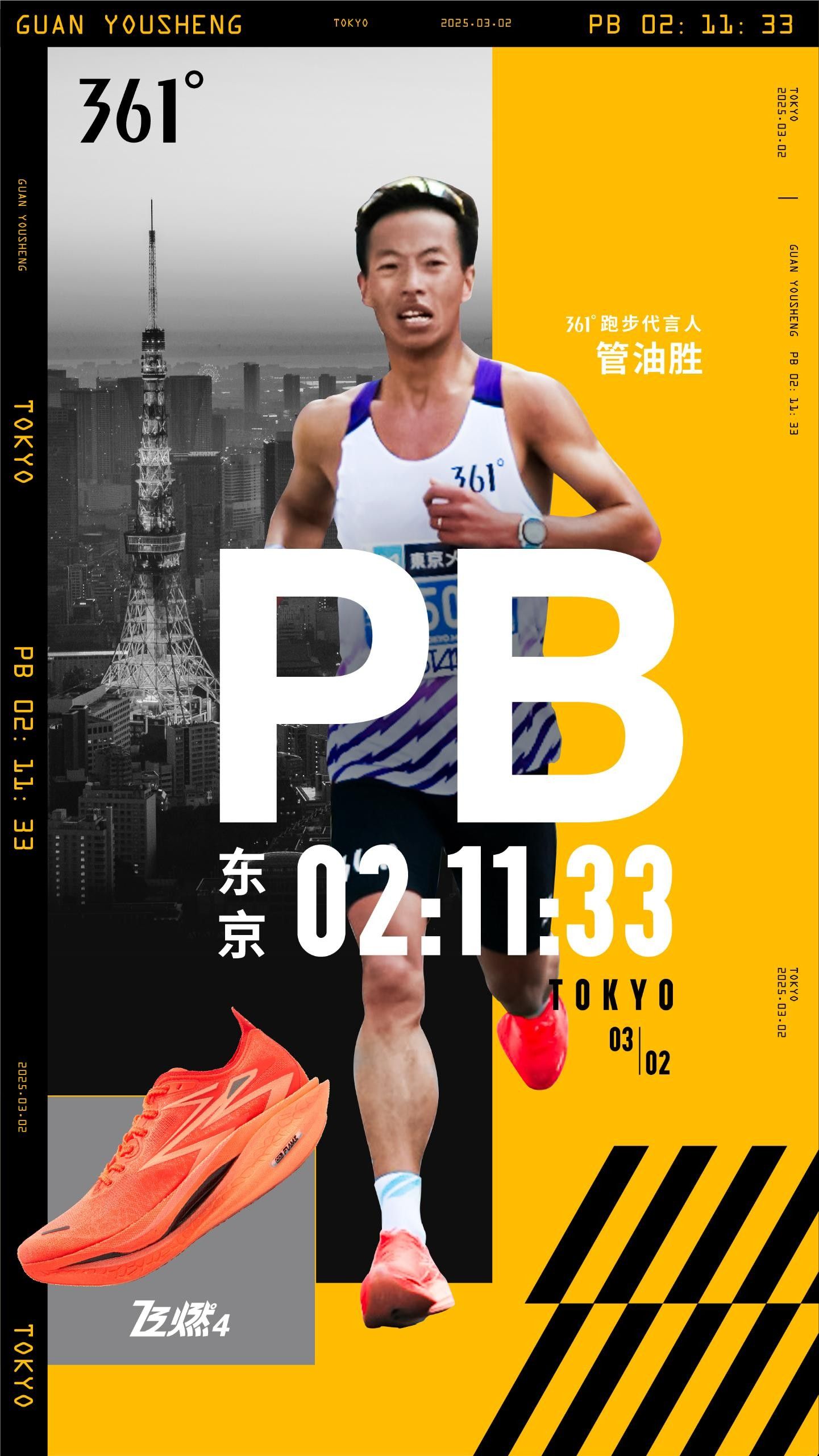 本屆東京馬拉松匯聚多位全球頂尖選手參與,361°跑步代言人管油勝憑借飛燃4出色賽道性能的助力,在2025東京馬拉松中以2小時11分33秒的成績強勢刷新個人最佳成績(PB),展現其穩定的競技狀態。
