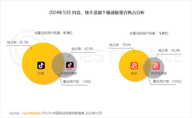 在極速版流量補充下,抖音、快手整體達到新的流量高度,QuestMobile數據顯示,截止2024年12月,抖音與抖音極速版APP去重活躍用戶規模達9.78億,快手與快手極速版APP去重活躍用戶規模達5.87億。
