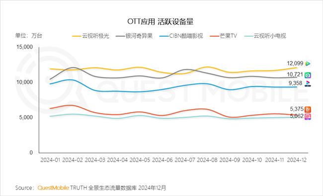 “頭部版權內容+大屏視聽技術迭代+家庭場景剛需“ 共同驅動OTT端應用流量提升,QuestMobile數據顯示,騰訊視頻、愛奇藝大屏端OTT應用云視聽極光、銀河奇異果流量穩定在億級以上,截止2024年12月,活躍設備量分別達到1.21億臺和1.07億臺。