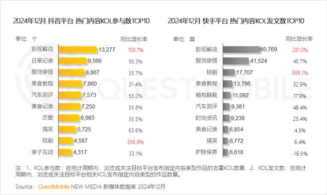 II. 影視解說、短劇等內容成為短視頻平臺KOL參與及發文熱點類型;同時,服飾穿搭、汽車評測、美食教程等類型在過去一年中也在抖音和快手上實現了快速增長