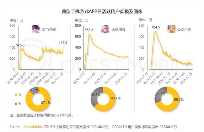 QuestMobile數據顯示,疊紙游戲旗下《戀與深空》《無限暖暖》與心動公司旗下《心動小鎮》聚焦女性玩家,實現了用戶增長和市場突破;尤其《戀與深空》通過持續運營活動促活,2024年12月31日活躍用戶規模達419.5萬,為游戲上線后的新高。