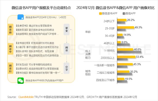 微信讀書補足了微信在線閱讀的生態服務版塊,QuestMobile數據顯示,微信讀書APP用戶多為一線&新一線城市、35歲以下、具有中高消費能力的群體。