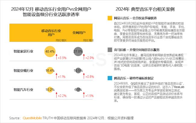 QuestMobile數據顯示,移動音樂行業用戶相較全網整體用戶,對智能設備各細分行業有更高的活躍滲透率,且同比也保持更高的增長,突出反映他們對各類智能設備終端的使用和場景需求。