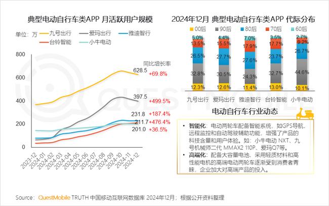 QuestMobile數據顯示,2024年12月,九號出行、愛瑪出行、雅迪智行、臺鈴智能、小牛電動APP用戶主要集中在90后、80后,占比超50%,其中小牛電動在90后、80后比例最高,達71.3%。