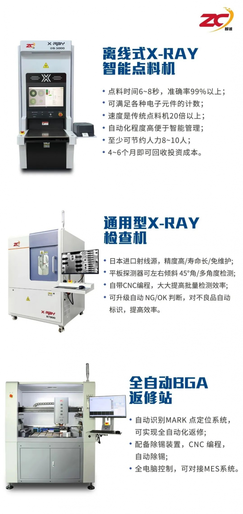 智誠精展是一家專業X-RAY檢查機、X-RAY智能點料機和BGA返修設備制造商。智能離線式自動點料機,是利用X-Ray透視原理及配合自主研發具有AI功能的算法軟件,可以快速準確的核算出料盤中物件的數量,同時具有自動掃碼上傳數據至MES、ERP等系統。通用型X-RAY檢查機是一款大型微焦點X射線檢測設備,適用于電子制造和半導體、BGA、FPC、LED、電池、鑄造等;全自動BGA返修設備是采用Mark識別精準對位,適用于任何BGA芯片器件、5G服務器、特殊及高難返修元器件及大型服務器主板的返修。