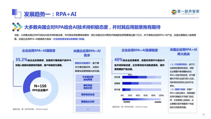 報告認為,行業未來的發展關鍵點在于AI與RPA的結合。目前,大多數央國企對RPA結合AI技術持積極態度,并對其應用前景抱有期待,部分央國企在AI等技術領域的投資預算高達數十億元。