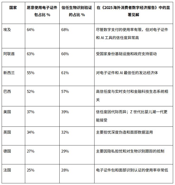 Checkout.com 在上半年發布的《2025海外消費者數字經濟報告》對 16 個國家的 18,000 名消費者進行了全球調查,揭示了全球消費者對數字身份解決方案的看法和采用信任度的明顯差距。雖然電子證件已成為數字經濟的基礎層,但研究表明,因文化規范、監管環境和新興技術接觸度的多方影響,不同地區對接受數字化技術態度存在顯著差異。同時,AI 電商代理(由 AI 驅動,可代表消費者完成購物行為的工具)的興起,更加突顯了身份驗證在交易中的重要性。