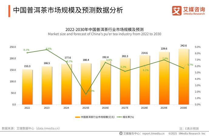 正是這一獨特特質,讓普洱茶在當下的消費市場中持續煥發活力,呈現出穩健增長的態勢。iiMedia Research(艾媒咨詢)數據顯示,2024年普洱茶市場規模已達177.6億元,預計到2030年將達242.6億元。這一增長勢頭的背后,既得益于消費升級背景下消費者健康意識的覺醒,人們愈發追求“越陳越香”所蘊含的養生價值,也離不開產業端在產品形態與渠道上的創新探索。