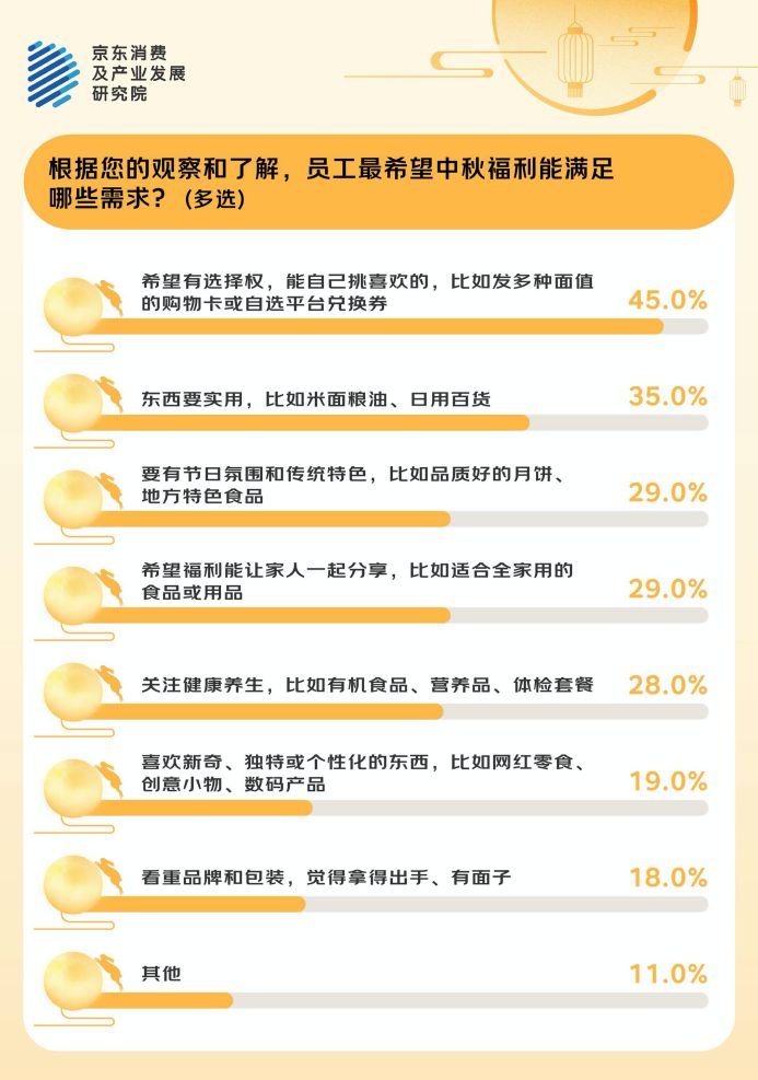 從采購人視角看,員工對中秋福利核心訴求集中在“靈活自主、實用且具節日特色”三大維度:45%的員工希望有選擇權,能在預算內自主挑選商品;35%看重實用性,偏愛米面糧油等日常剛需;29%期待節日氛圍,既要有品質月餅等傳統元素,也要能讓家人共享。在多元化需求驅動下,采購人傾向在標準化與個性化間尋找平衡,既保留中秋的儀式感,又融入健康、家庭等場景化關懷。