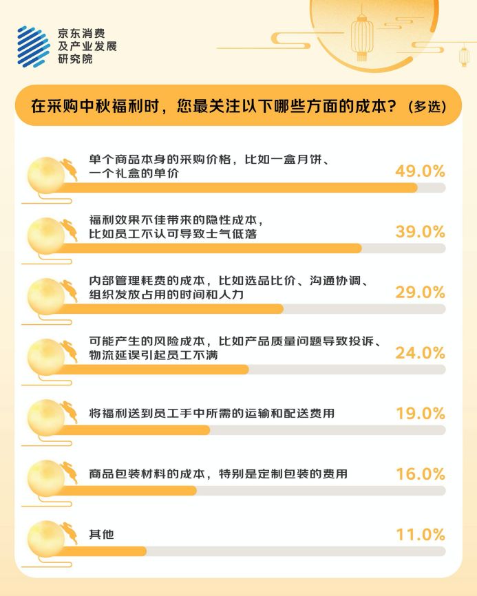 在這一趨勢下,成本控制成為采購全鏈路的關鍵考量。49%的采購人最關注單個商品的直接采購價格,從月餅單價到禮盒成本精打細算;39%的采購人特別警惕福利效果不佳帶來的隱性成本——這遠非金錢可以簡單衡量,員工滿意度低、缺乏認同感導致的負面影響,甚至潛在的人才流失風險,都構成了不可忽視的隱性損耗。29%聚焦內部管理成本,選品比價、跨部門溝通協調、處理退換貨等流程消耗的人力與時間成本成為優化重點。從直接支出到隱性損耗與管理效率,構建起覆蓋采購全鏈路的綜合成本意識。這也為采購人通過優化流程或引入數字化工具來提升效率創造了空間。