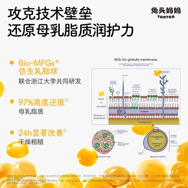 倍潤乳脂系列的核心優勢源于兔頭媽媽與浙江大學聯合研發的仿生乳脂球Bio-MFGs?技術。該技術通過“天然植物油脂”仿“母乳脂質”,合成與母乳脂球相似度達97%的仿生成分,1:1還原母乳脂質的營養結構與呵護力。研究數據顯示,該成分可24小時內提升肌膚含水量69.94%,同時將炎癥因子減少14.82%、皮膚刺激降低16.18%。這一成果兔頭媽媽聯合浙江大學在國際期刊《ACS Food Science & Technology》發表,標題為 “Physical Properties and Stability of Oleogels and Oleogel Emulsions Based on Human Milk Mimic Oil”(譯為“基于仿生乳脂凝膠及其乳液的物理性質和穩定性的研究”)的文章。文章研究的核心對象正是兔頭媽媽自研仿生專利“仿生乳脂球Bio-MFGs?”,這也是中國嬰童護膚領域少有的學術突破。