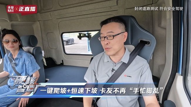 展新副總經理親自駕駛,帶領央視主持人體驗了乘龍翼威5的高速行駛、“一鍵爬坡+恒速下坡”功能以及強化壞路測試等多項性能,讓觀眾直觀領略到乘龍翼威5的強勁動力與卓越智能制動控制表現。