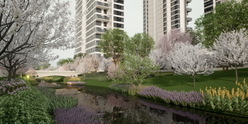 設計通過構建自然山水的意境、空間流轉的景觀游線以及高低錯落的立體花園,打造八重禮遇歸家及十大雅事居游體系,營造“流動”的園林體驗感和豐富的空間層次,展現步移景異的宋式風韻。