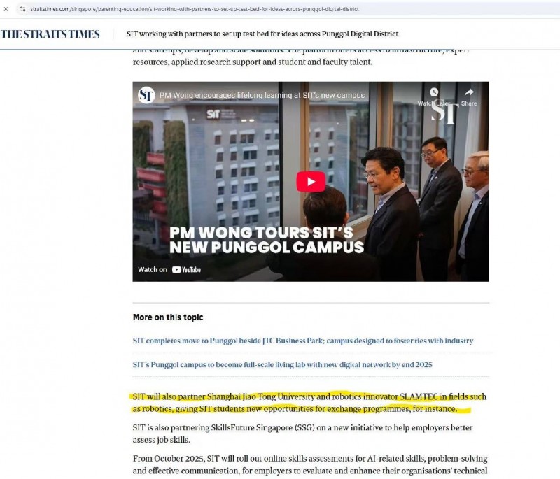 此次新加坡理工大學新校區的正式啟用以及新加坡理工大學、上海交大與思嵐科技的三方合作引發了廣泛關注,海峽時報(The Straits Times)、《聯合早報》等多家新加坡頭部媒體均在頭版頭條對本次合作進行了重點報道。