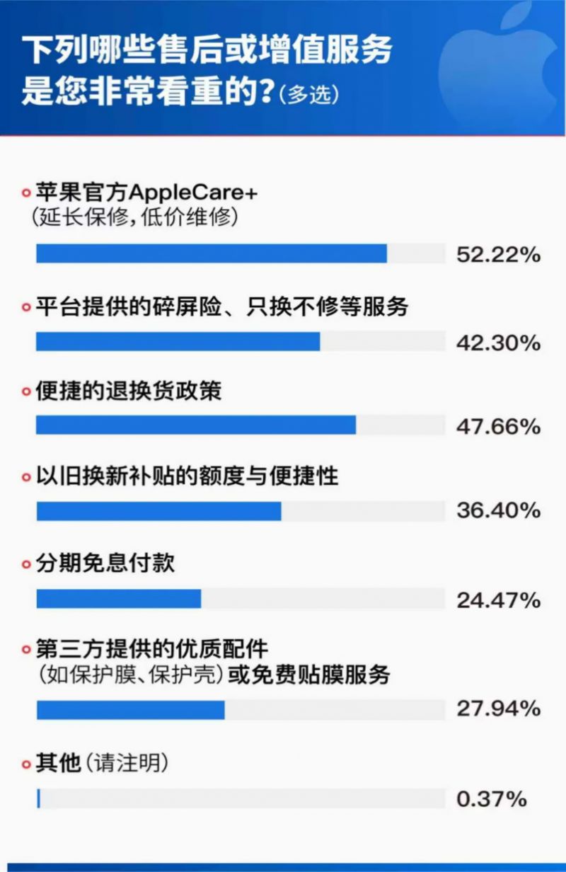 對于售價高昂的數碼產品而言,售前售中售后的全鏈路服務同樣關鍵。38.71%的用戶非常看重“售后保障政策完善”,47.66%的用戶認為“便捷的退換貨政策”很關鍵。我們注意到,京東將蘋果官方的AppleCare+、平臺提供的“只換不修”服務以及“以舊換新”(38.83%的用戶使用)整合為一站式體驗,消除用戶購機后顧之憂。