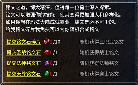 在角色欄可以看到,玩家可以裝配三個銘文,第一個銘文槽默認開啟,后兩個需要消耗金幣和對應職業的銘文石才能解鎖。職業銘文石可以在精英怪和boss身上獲取,也可以直接用銘文石碎片在合成大師NPC處合成。