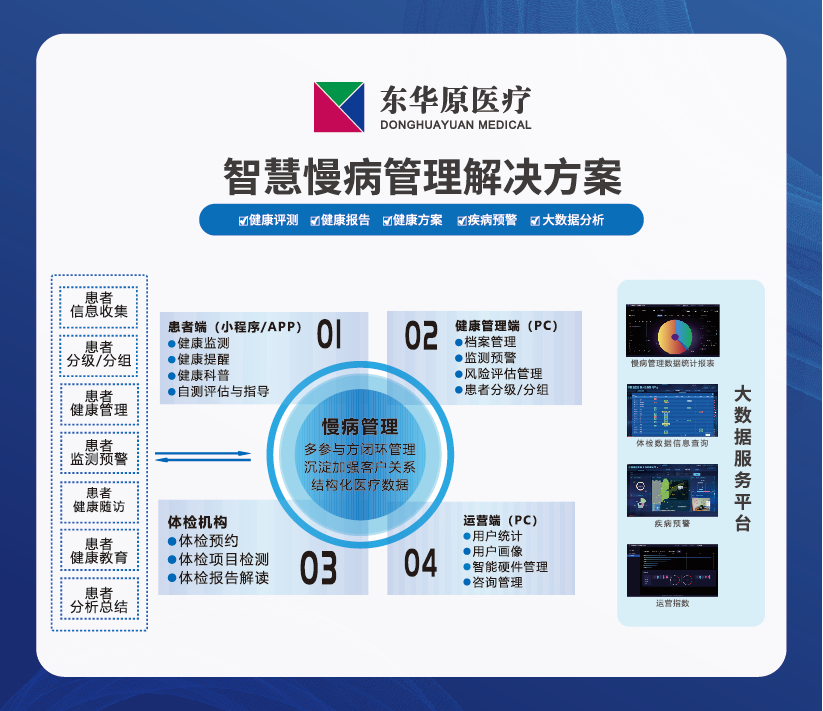 東華原智慧慢病管理解決方案為老人制訂個體化的慢病管理方案,包括科學的飲食、體育鍛煉和適度的康復,做精做細的同時,并能及時觀察老人的身體狀況變化,如心率、血壓、血糖等,將這些數據上傳至系統,為每位老人建立詳細的電子健康檔案,記錄老人的基本信息、病史、體檢報告、診療記錄等,可讓家人和醫生隨時了解老年人的健康狀況,做好日常慢病管理。