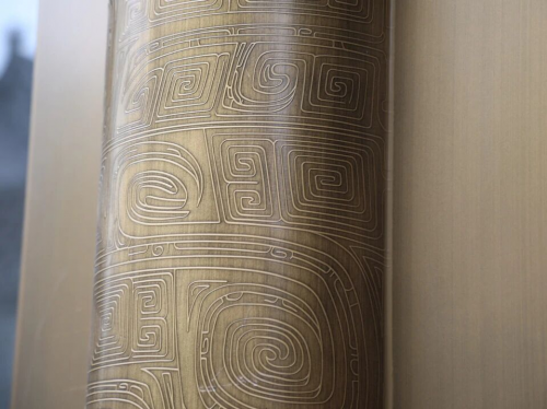 17號樓鋁仿銅柱柱體紋飾取自河南洛陽出土的國寶級文物——商代獸面紋銅方鼎,紋飾以云雷紋為底,主紋為獸面紋,形象生動,層次分明。為了能夠直觀評判蝕刻圖案的觀感與整體效果,團隊利用三維彩繪噴涂技術進行仿真打樣,并在現場制作1:1 視覺樣板,在加工階段,通過調整酸腐蝕精確位置,達到不同紋路的深淺不一的效果,保證設計圖案最優呈現。