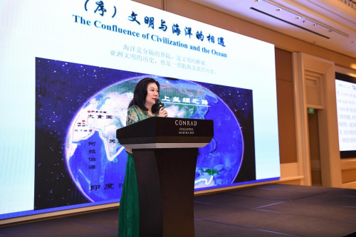 國際鄭和學會會長張露致辭,她表示,學會打造跨越學界商界的文化經貿平臺,通過高端論壇與跨界項目,重構鄭和海絲文化的國際敘事。學會先后在馬六甲、新加坡、悉尼、馬斯喀特等地舉辦高端論壇。學會計劃超越傳統學術圈層,構筑由學界泰斗、商界領袖、金融精英與外交使節共同組成的傳承聯盟,現在通過3D動畫《鄭和奇幻旅程》、光影博物館及沉浸式展覽《絲路江心鏡》,以現代形式重塑古老精神。