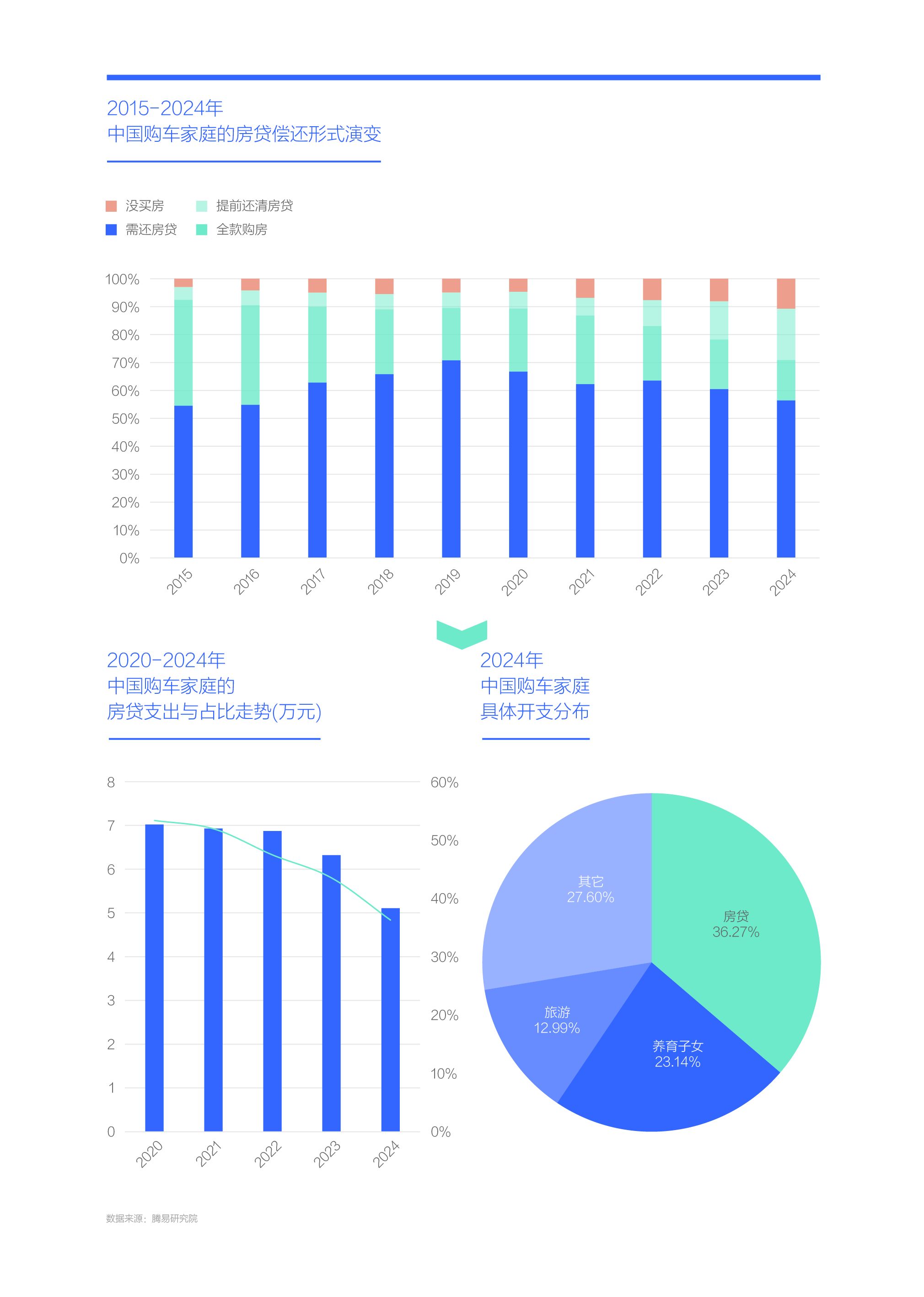 上述一系列變化共同降低了中國購車家庭的房貸壓力,2020-2024年購車家庭的房貸開支由7萬多降至5萬多,房貸支出占比由50%多快速降至40%以內。2024年,雖然房貸開支仍是中國購車家庭的第一開支,占比36.27%,但比曾經過半的開支占比少了一大截;