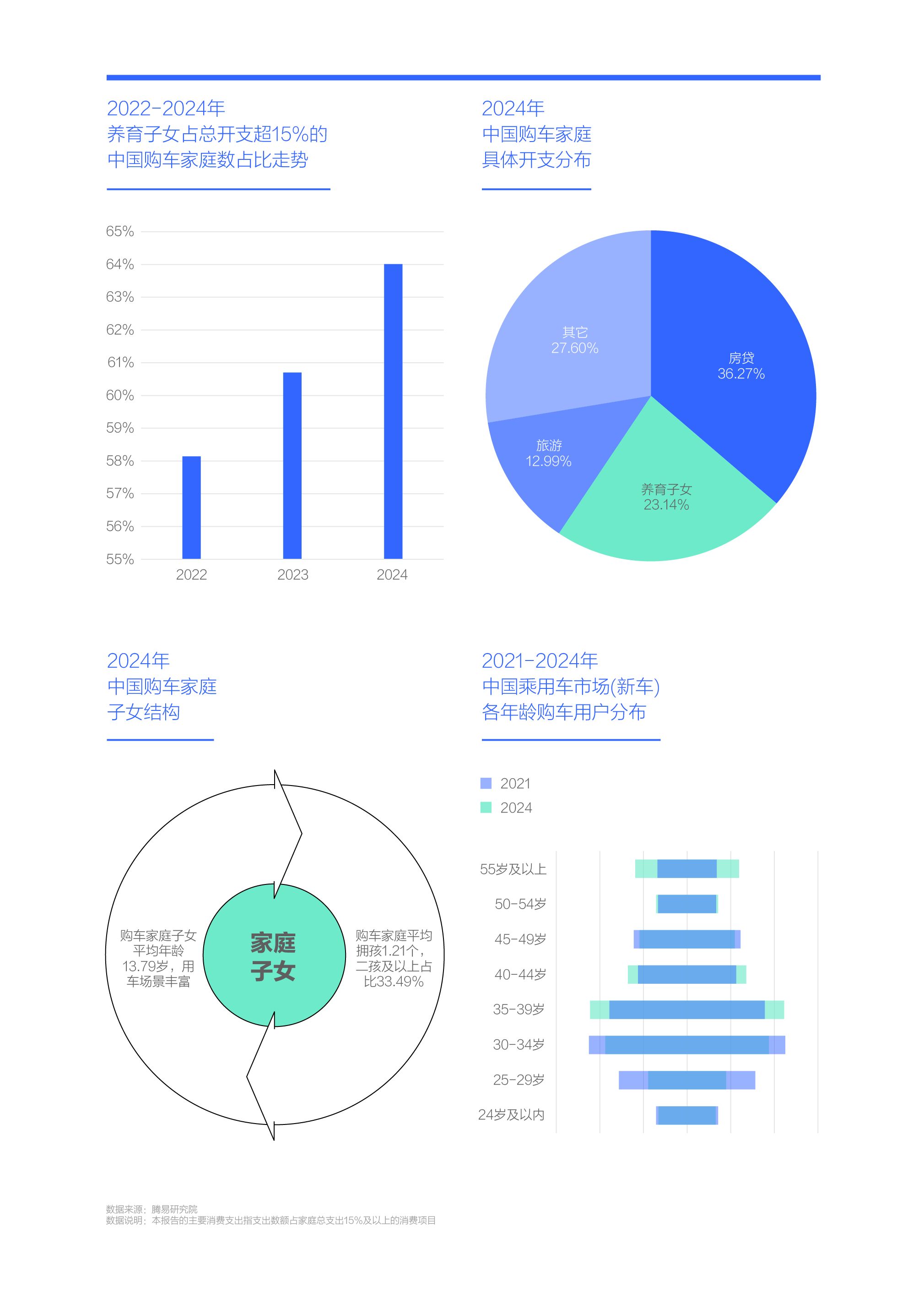 近幾年,養育子女的開支權重進一步提升,2024年超64%中國購車家庭的養育子女開支占比超過15%,養育子女占總開支的比例升至23.14%,僅次于第一大開支房貸;雖然房貸長期位居中國購車家庭的第一開支地位,但近二十年中國購房以結婚為主,透支多數家庭財富,容易稀釋購車開支,壓制車市的個性化、品質化等訴求,影響高質量發展。對比房貸,養育子女與購車的關系更緊密,涉及上下學接送、周末補習接送、寒暑假自駕游等諸多需求。為了更好養育子女,家庭會更積極選購適合的車型;