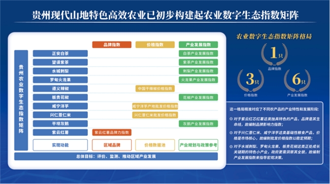 貴州農特產業指數矩陣形成了“1+3+6”的指數體系,包括1只品牌指數、3只價格指數和6只產業發展指數,涵蓋了遵義辣椒、水城刺梨、羅甸火龍果、興仁薏仁米、威寧馬鈴薯、正安白茶、望謨紫茶、關嶺板貴花椒、平壩灰鵝、紫云紅薯等十大特色農產品。