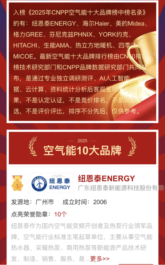 空氣能采暖品牌怎么選?究竟哪款產品更符合家庭需求?近日,十大品牌網(CNPP)通過專業獨立調研測評、AI人工智能、大數據等綜合分析后,發布了《2025年CNPP空氣能十大品牌榜中榜名錄》,上榜的有紐恩泰、海爾、美的、格力等品牌,為消費者的雙11選購提供了參考。本文將深度分析榜單中十大品牌的核心優勢,并推薦合適的產品,為您的冬季采暖提供清晰的解決方案。
