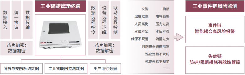 依托事件鏈模型梳理的風險要素及管理手段,部署天澤自研的工業智能管理終端,對消防物聯網監測設備、工業物聯網設備、生產運行設備、視頻AI監控、安全工作執行規范等多類關鍵數據進行采集整合、分析與處理,形成事件鏈智能監管系統,通過對設備/節點的管理,加強對高風險事件的防護與阻斷措施管理。