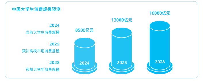高校消費市場早已不是傳統的“校園經濟”概念。據《2025掌上大學中國高校藍皮書》顯示,2024年中國在校大學生年度消費規模已達8500億元,預計到2025年將突破1.3萬億元,2028年增至1.6萬億元,年均增長率約5%。