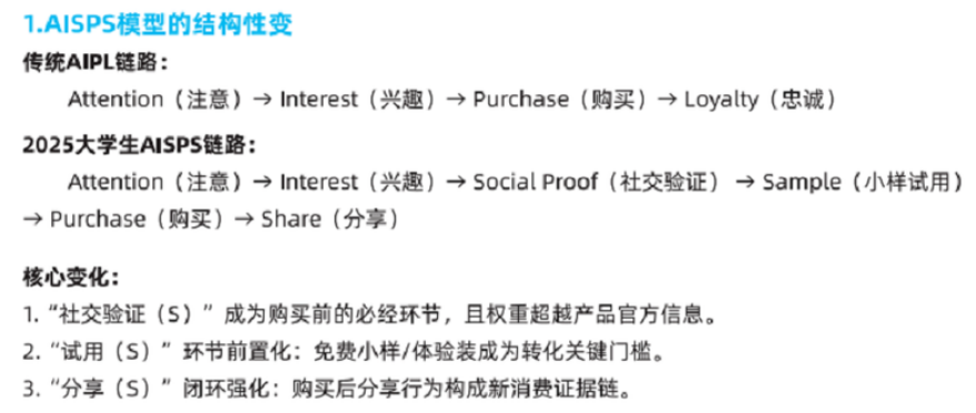 掌上大學《藍皮書》最顯著的貢獻是提出了全新的AISPS消費者決策模型(注意-興趣-社交驗證-小樣試用-購買-分享),這一模型的提出是對傳統AIPL理論的重要革新,尤其精準地捕捉了Z世代大學生消費決策中的兩個核心環節:“社交驗證”和“小樣試用”。