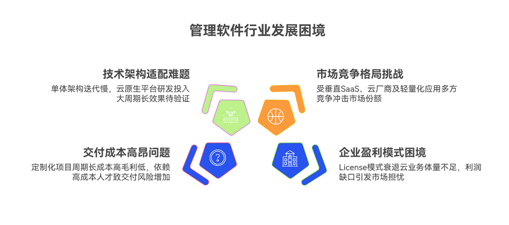 頭部廠商的“慢性病”表現為高營收增長與低凈利潤率長期并存、云業務增速難以彌補傳統license收入下滑、研發費用率持續高企,吞噬利潤空間。而個別企業的“急性發作”為大項目拖累導致資金鏈斷裂、高度依賴的定制化項目模式失去可持續性、人力成本高企與回款緩慢的雙重擠壓。
