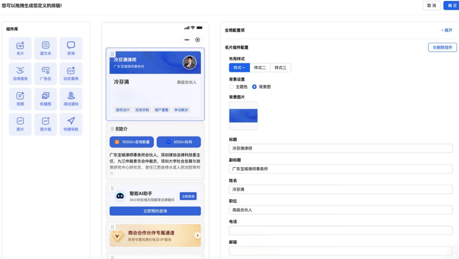 AI律師智能體致力于為律師打造個性化專業工作臺,助力提升工作效能與品牌影響力。律師可根據自身業務領域和服務習慣,靈活配置工作界面布局與互動方式,結合AI助手、內容管理與智能營銷工具,全面提升法律服務的響應速度、專業表現與客戶觸達能力,通過構建專屬的數字法律助手,塑造具有影響力的個人專業品牌。