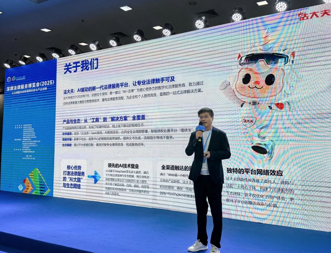 展會期間,法大夫創始人冷芬滿在路演區開展了“AI重塑法律服務,讓專業法律觸手可及”主題分享,系統闡述了法大夫的技術路徑與行業思考。他介紹,法大夫以DeepSeek為技術底座+自研法律垂類大模型,構建起“軟件服務+智能終端+生態鏈接”的產品矩陣,已形成覆蓋企業、個人、政府、律所、律師的全場景解決方案。