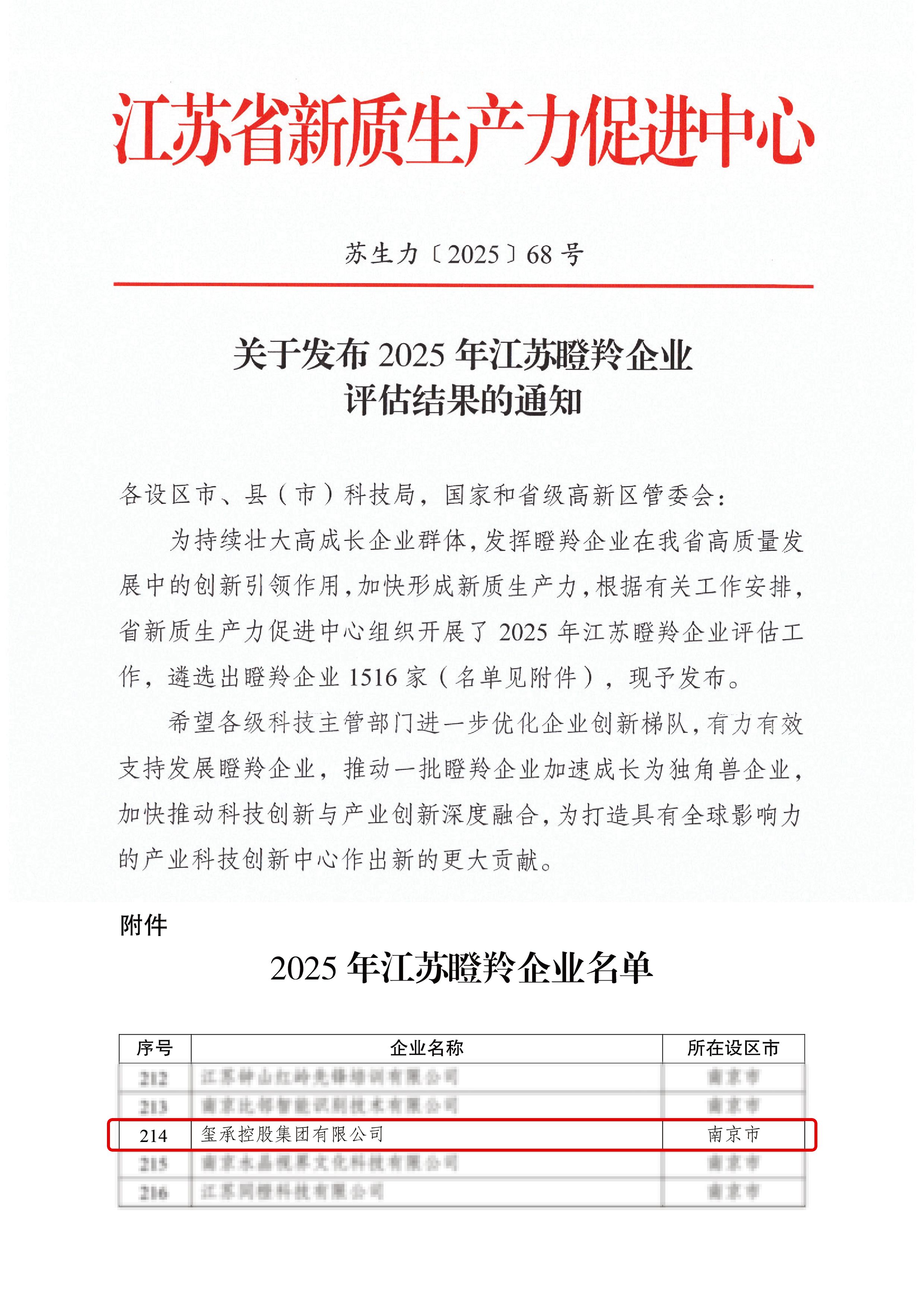 近日,江蘇省新質生產力促進中心正式發布 2025 年江蘇瞪羚企業評估結果,璽承集團憑借在數字零售領域突出的創新能力、強勁的增長勢能與強大的行業影響力,榮膺2025年 “江蘇瞪羚企業” 稱號。