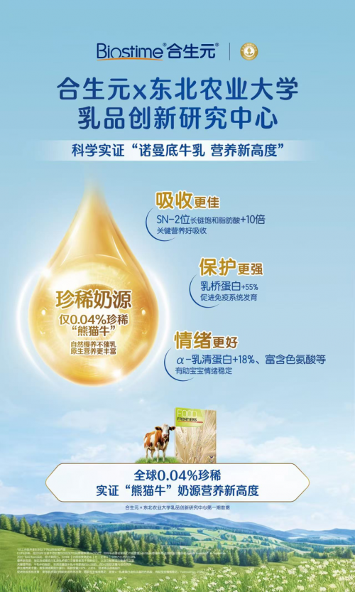在深耕奶源品質的道路上,合生元還致力于深挖“熊貓牛”奶源的營養價值。近期,“乳品創新研究中心”首個諾曼底牛乳源研究成果在國際權威食品前沿雜志《Food Frontiers》重磅刊登。該研究顯示:“熊貓牛”奶源SN-2位脂肪含量高,SN-2位長鏈飽和脂肪酸相比荷斯坦牛高10倍,更接近母乳脂肪構成,更豐富的保護力成分如乳橋蛋白+55%,以及更多乳源活性成分如α-乳清蛋白,色氨酸等,這些成分與寶寶的免疫提升、情緒穩定有關。“熊貓牛”奶源研究成果不僅科學展示了諾曼底“熊貓牛”奶源的營養優勢,也推動了合生元奶粉在營養配方以及工藝上的不斷精進,持續突破品質天花板。