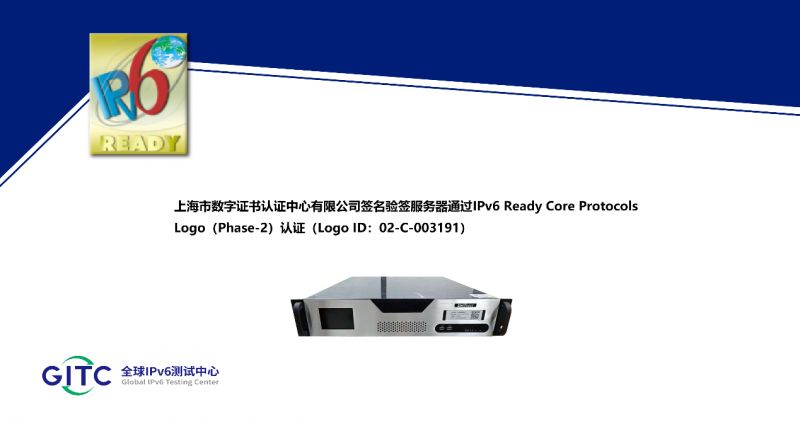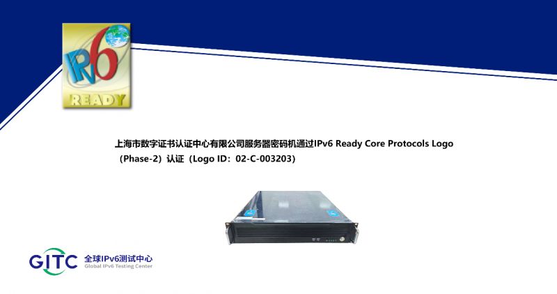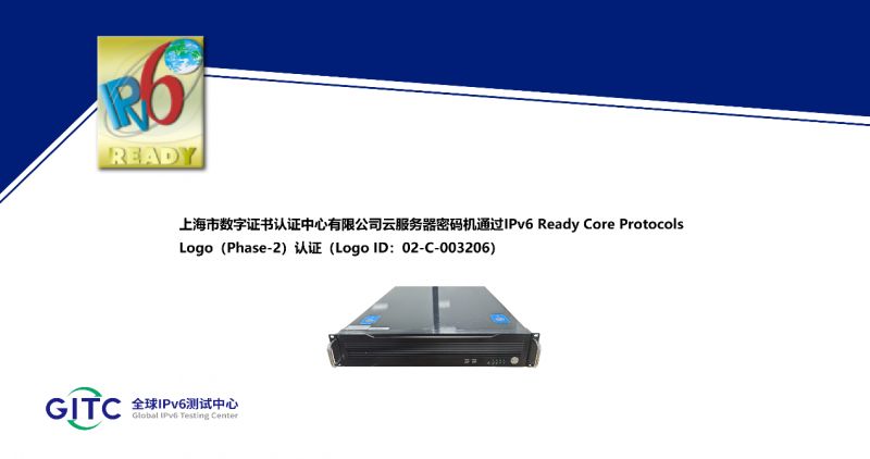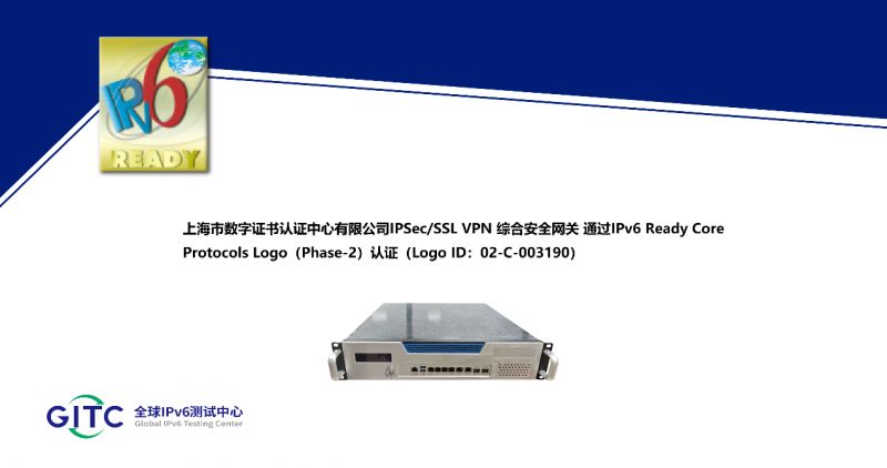近日,上海市數字證書認證中心有限公司旗下IPSec/SSL VPN 綜合安全網關、簽名驗簽服務器、服務器密碼機、云服務器密碼機在下一代互聯網國家工程中心-全球IPv6測試中心正式通過IPv6 Ready核心協議Phase-2測試,并榮獲由國際組織IPv6 Forum頒發的IPv6 Ready Logo Phase-2認證證書。這標志著上述產品的IPv6核心協議實現已全面符合IETF RFC相關標準,其一致性和互通性得到了權威驗證。