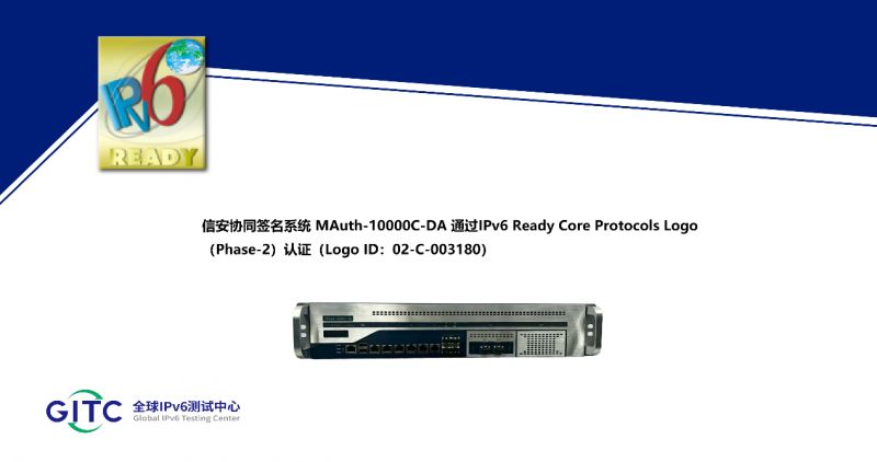 近日,北京信安世紀科技股份有限公司旗下信安NetTSA可信時間戳服務器 NetTSA、信安協同簽名系統 MAuth-10000C-DA、信安零信任統一身份認證管理系統 NetAuth、信安NetCert KMC密鑰管理系統、信安NetCert CA數字證書認證系統 NetCert CA、信安CSSP密碼安全服務管理平臺 CSSP在下一代互聯網國家工程中心-全球IPv6測試中心正式通過IPv6 Ready核心協議Phase-2測試,并榮獲由國際組織IPv6 Forum頒發的IPv6 Ready Logo Phase-2認證證書。
