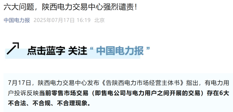 陜西電力交易中心發布《告陜西電力市場經營主體書》指出,有電力用戶投訴反映當前零售市場交易存在6大不合法、不合規、不合理現象。其中,部分售電公司利用信息差,向用戶傳遞錯誤的市場政策和行情信息,偽造假公章、假合同的方式簽約用戶,在用戶不知情的情況下開展電力交易。