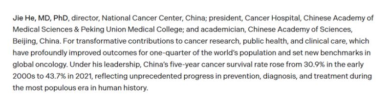 “在他帶領下,中國癌癥五年生存率實現跨越式提升,從21世紀初的30.9%提高到2021年的43.7%,在人口規模最大的國家創造了癌癥防治領域的空前進步。”