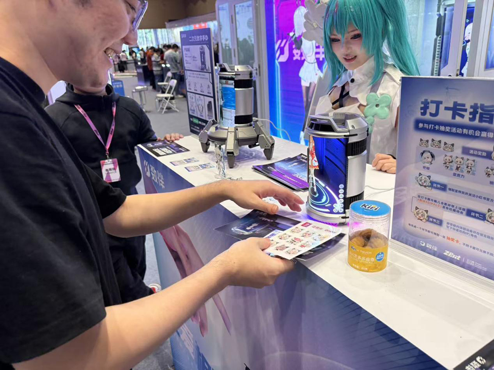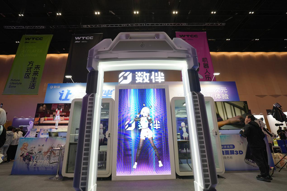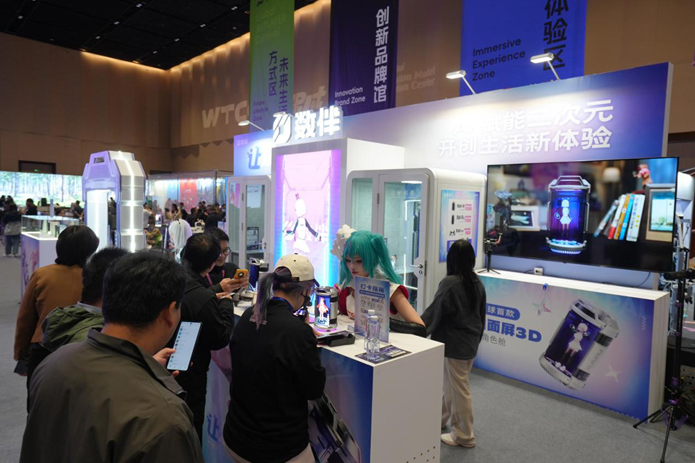 數伴展位以“AI·次元交互體驗”為主題,打造了兼具科技感與趣味性的沉浸互動空間。兩位人氣Coser分別飾演看板娘“姵兒”和“初音未來”,在現場與觀眾親密互動,吸引大家參與體驗環節與抽獎活動。現場氛圍熱烈,觀眾拍照打卡上傳至社交媒體,相關話題熱度持續攀升,成為WTCC期間備受年輕人關注的展位之一。