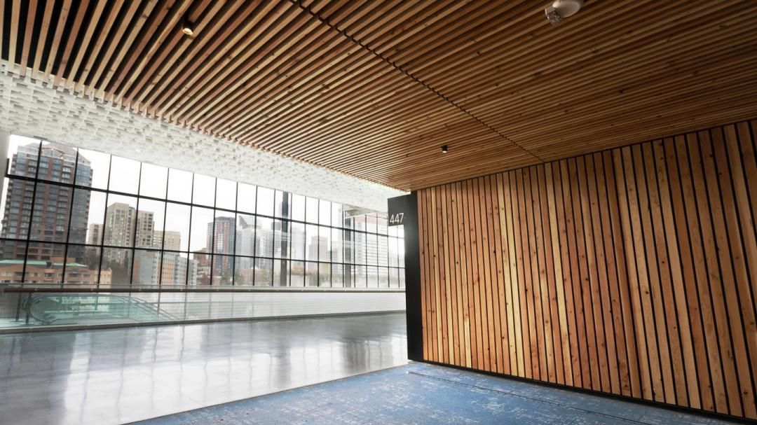 例如商場、辦公樓優先考慮視覺設計感和功能性。可選擇開透式、條形板或方格吊頂,兼顧美觀與空調、消防管道的隱藏需求。例如國際一線金屬建筑材料品牌普羅萬Provano,它的一款條形吊頂板,是透光式天花板,就很適配這類空間。條形吊頂板由統一的龍骨系統配合有多種高度選擇的鋁質材料組成,透光條板以扣入的方法與龍骨固定。該產品設計有通透、吸音的效果,能與空調通風口以及消防噴淋配合。而且多種高度的變化、顏色的變化更凸顯時尚優雅的線條。