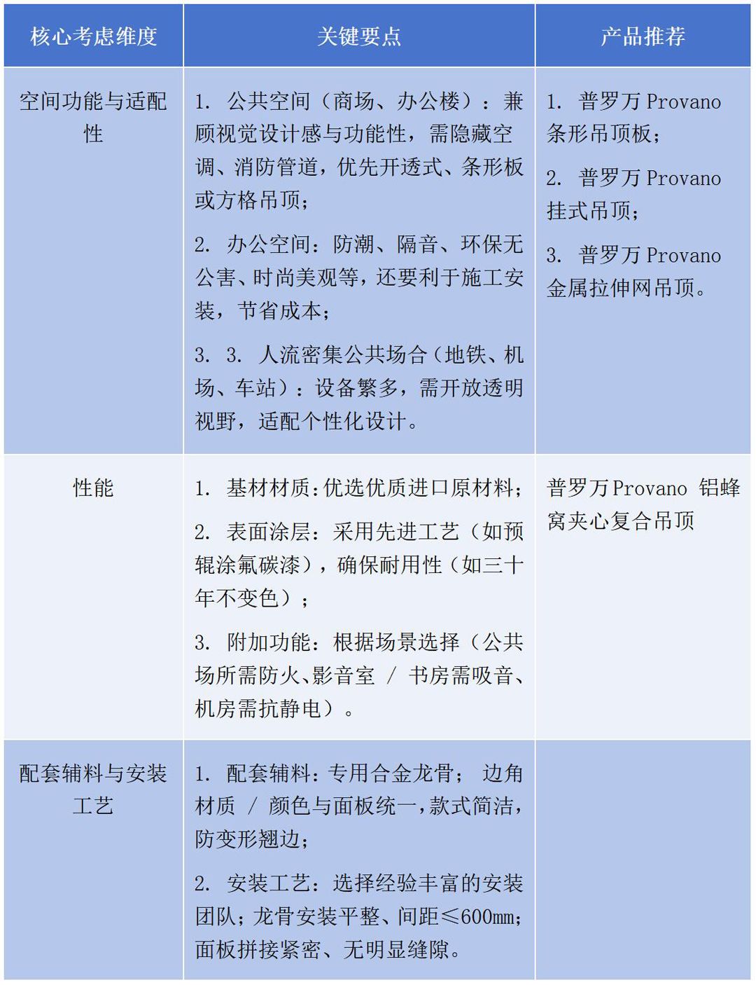 最后整理一個表格幫大家梳理一下挑選室內金屬吊頂產品的要點,希望這篇文章能夠幫助正在選擇金屬吊頂產品的你做出更專業的選擇。