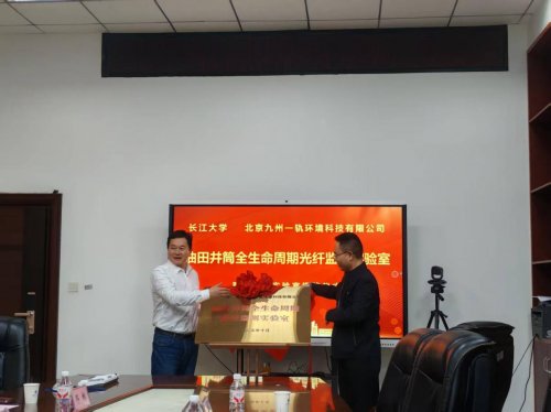 10月28日,北京九州一軌環境科技股份有限公司與長江大學石油工程學院在長江大學武漢校區舉行“油田井筒全生命周期光纖監測實驗室”揭牌儀式。長江大學石油工程學院常務副院長李忠慧、副院長鄭雙進,九州一軌副總裁兼副總工程師丁德云、聲紋信息研究院副院長高培正共同出席并揭牌。
