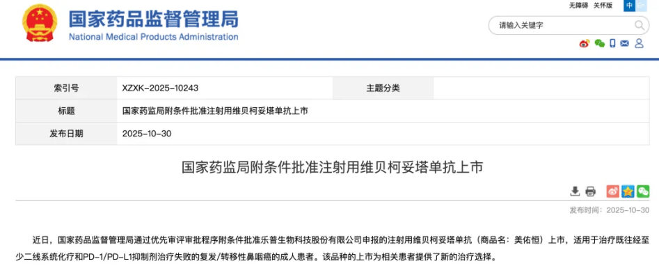 10月30日,國家藥品監督管理局(NMPA)官網顯示,樂普生物申報的的注射用維貝柯妥塔單抗(MRG003)獲批上市,用于治療既往經至少二線系統化療和PD-1/PD-L1抑制劑治療失敗的復發或轉移性鼻咽癌(NPC)患者。